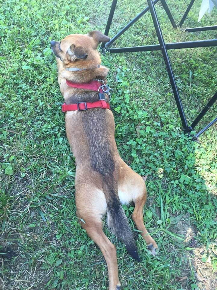 Just relaxing having fun on a nice day at home. Lady is a great dog. We rescued her. She is smart quiet and hates walmart. Only store she oops in. Great with animals people and kids.