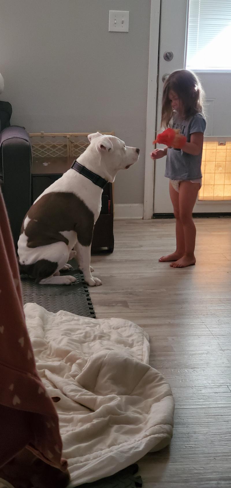 Boomie will play very well with others and loves children the most. Children can poke and prod and he wags his tail with excitement.