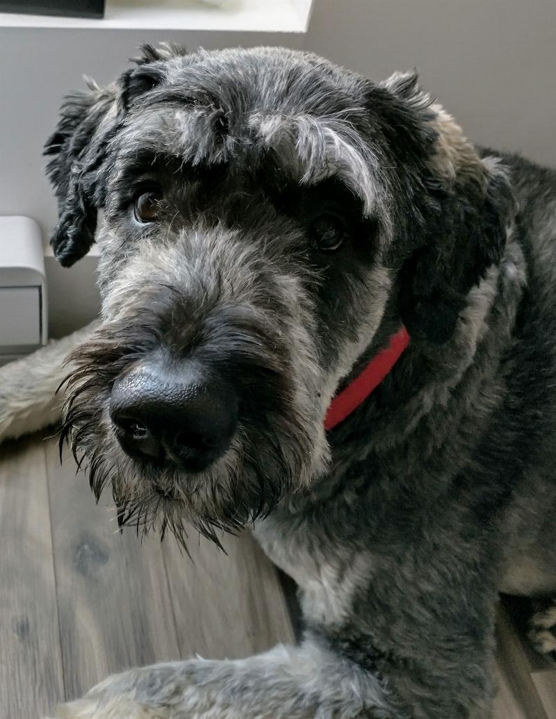 This is 8 year old Zack. He is approximately one hundred and 15 lbs . Zack belongs to my husband who has Lewy Body Dementia.