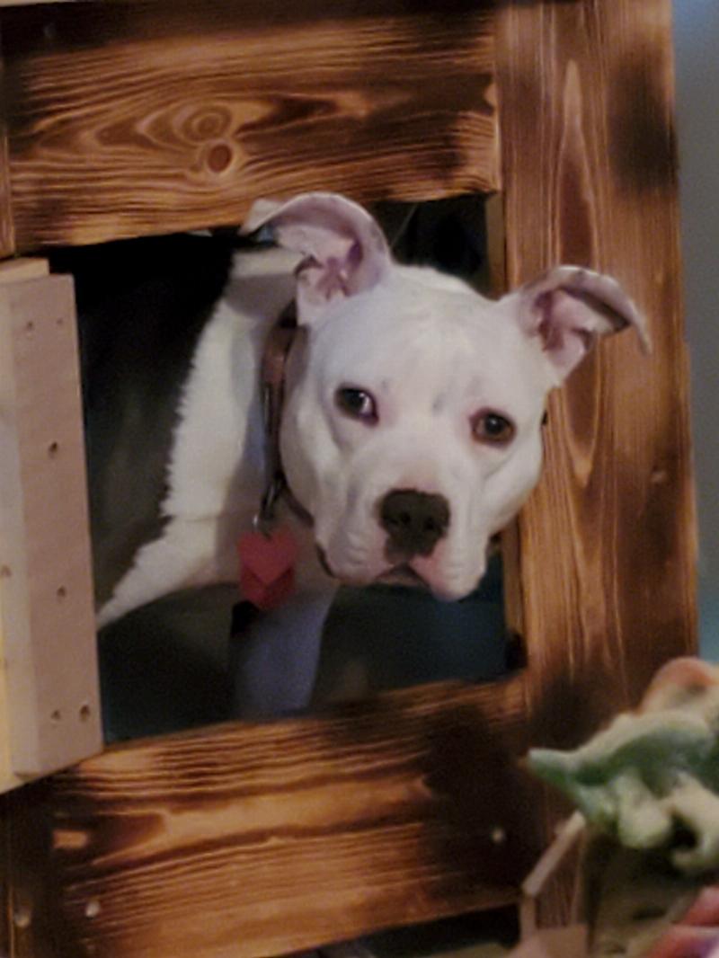 Gypsy looking out from her new kennel that I built. Shortly after this photo she chewed her way out more than once.