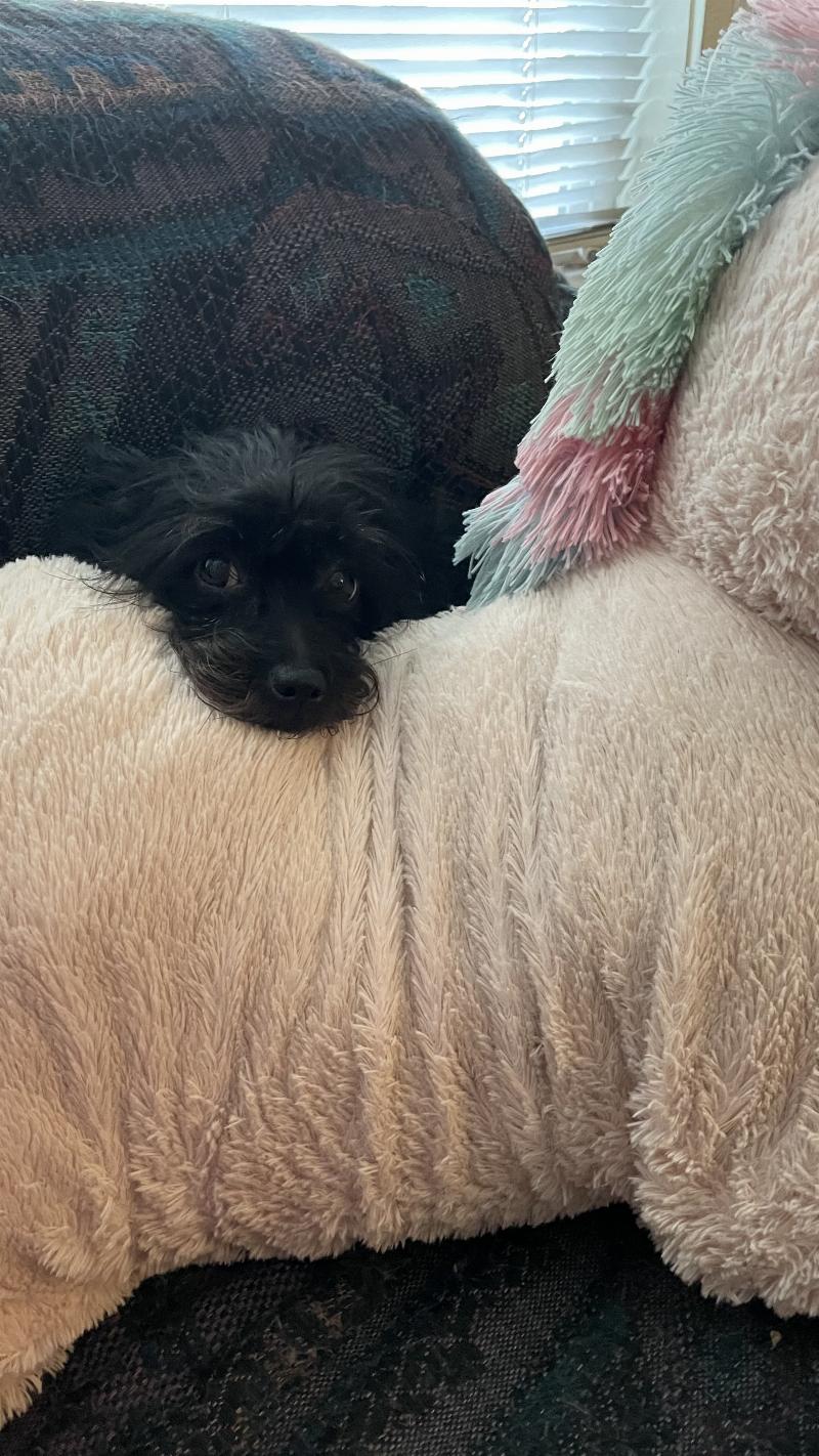 She loves to share the unicorn stuffed animal. She is peeking out to make sure your sitting by her and not going to sit on her. So sweet and loving. Will bark at door to let you know you walked into her house.