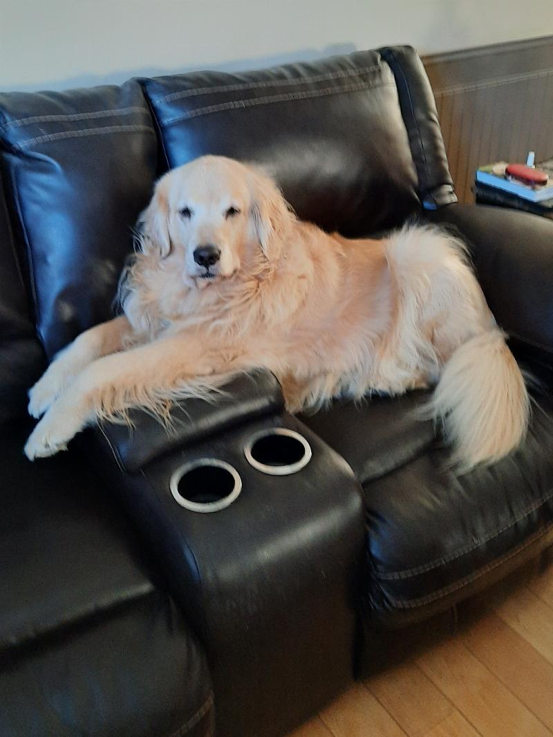 Bailey enjoying a day relaxing on the couch watching tv, wishing the covid would go away so he can get back to being a therapy dog. 2021
