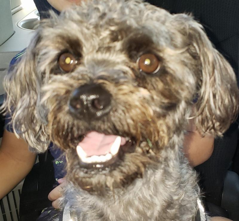 This photo is of our emotional support dog, Iris. She is a black, grey and brown poodle mix that we rescued from the pound.