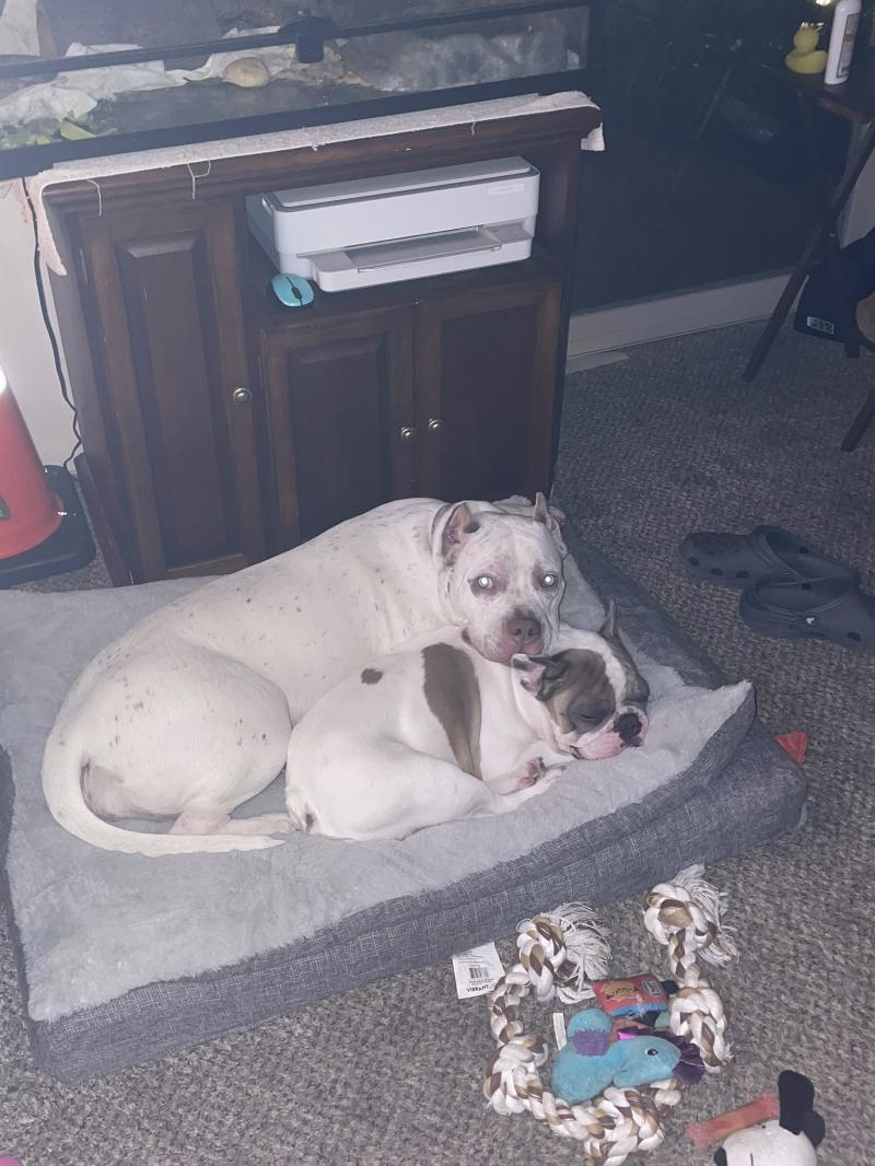 It’s ivory and my other dog she’s protecting him and cuddling with him. She loves to lay with him and play with him. She’s always protecting him.