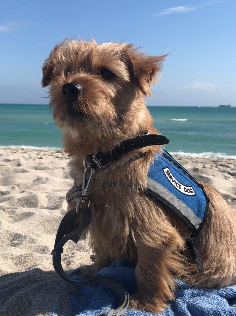 Jack posing with his service dog credentials at the beach with the wind blowing in his beautiful face. He had a great time.
