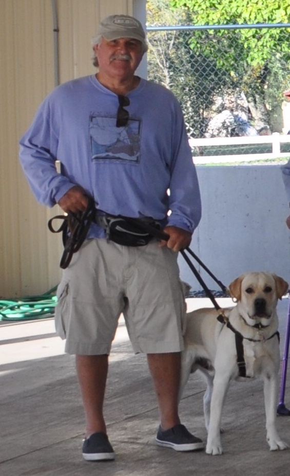 John and Renny working together learning teamwork on basic skills such as heel, stop, turn, wait, sit, stay, and watch me.