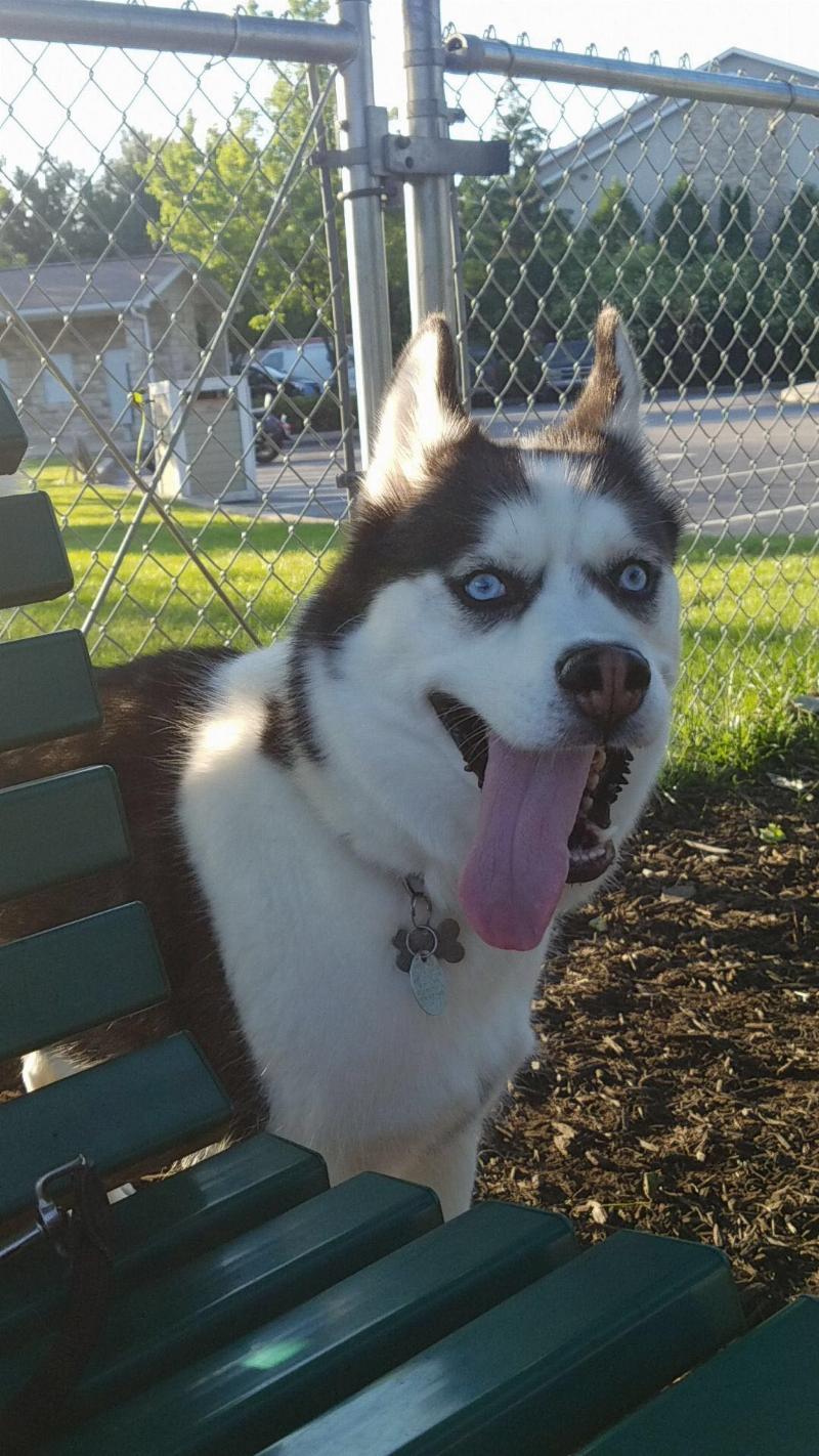 This is Juno at the local dog park having a blast and his tongue hanging out. It was a nice beautiful day and the sun was out and we spent a long time outside getting his energy out and had a great day.