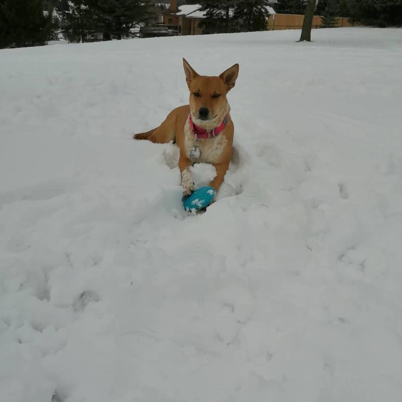 Kelly siting in the snow looking out. She loves to just look out the window or out the back worndow on to our back deck. Always wanting to chase something or go explore