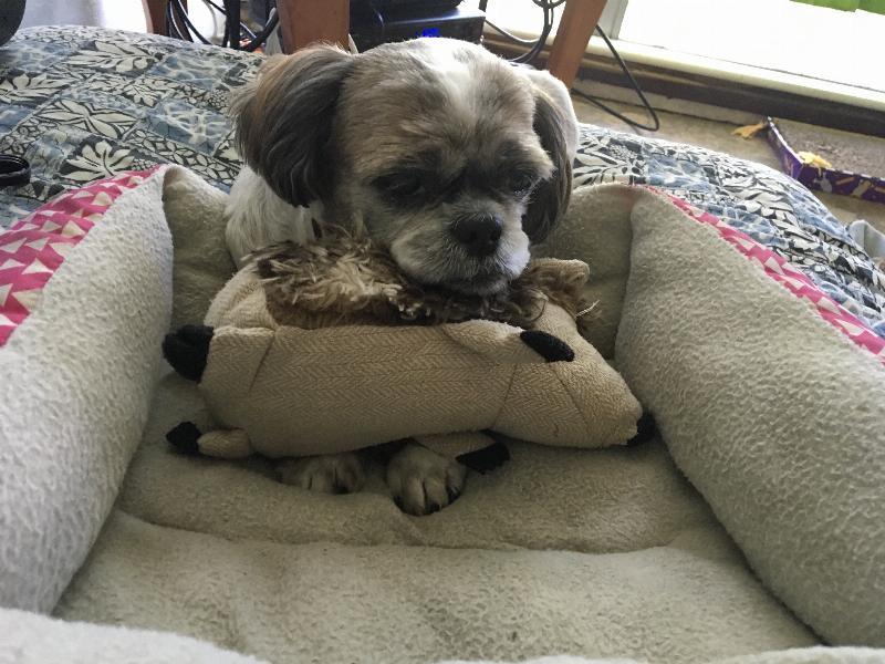 Just chillin with her hedgehog after a day at the groomers.  Kneesa loves to go shopping with me,her sister ,Bailey always together,  they  make the greatest tag team.