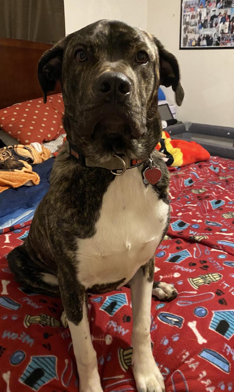 Loki just turned one year. He’s 96 pounds and stands three feet tall. His coloring has stayed the black and brown brindle. Loki has passed his canine good citizen test and has completed his assistance training