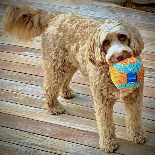 Lotte is a four year old Aussiedoodle. She is my service dog and has been trained to alert me when I need medication for my heart condition.