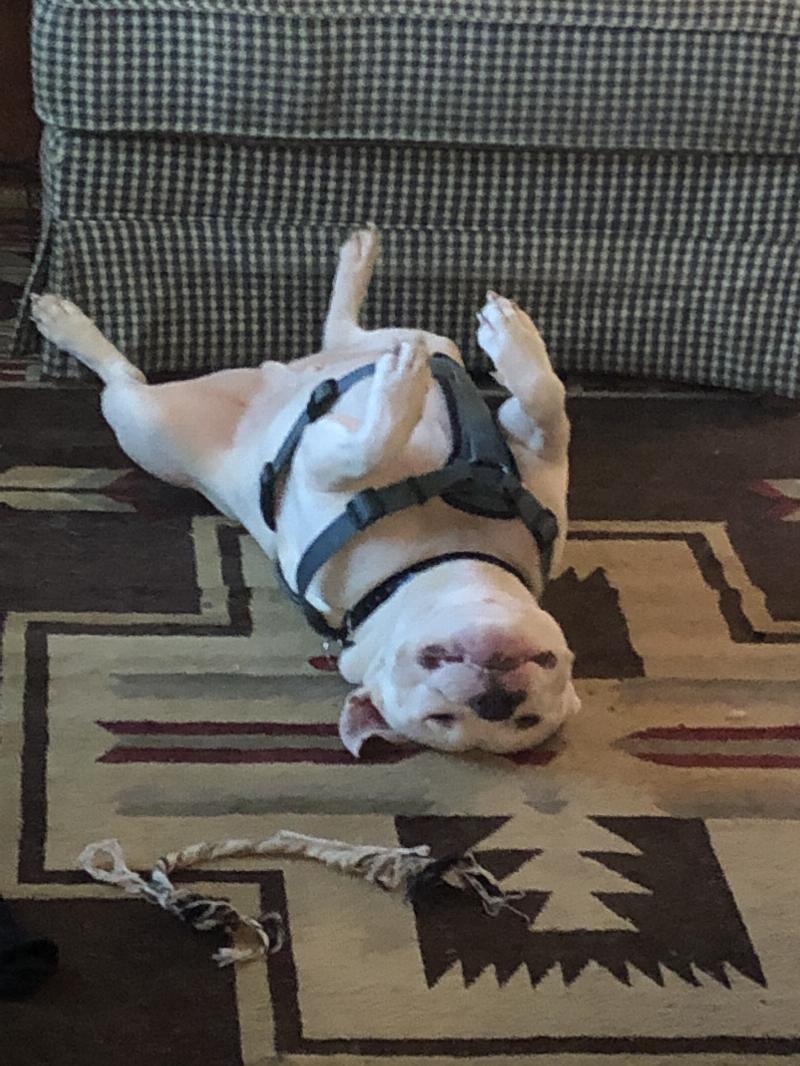 Happy to be home from ling trip to visit the extended family for Thanksgiving. loves a little roll around on the rug at his home.