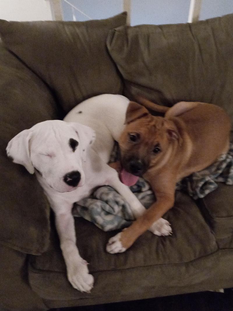 This is me and one of my first friends, he is a pitt bull and 1 month older than I am. Here we are taking a break from playing!!