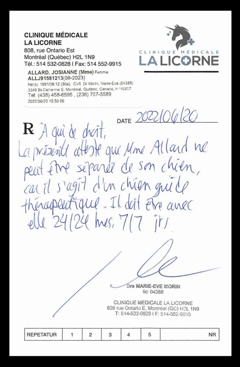 Familly Doctor’s Référence for Barb as à therapeutic guide dog. We cannot be separated, Barbie and I must stay together 24/7.