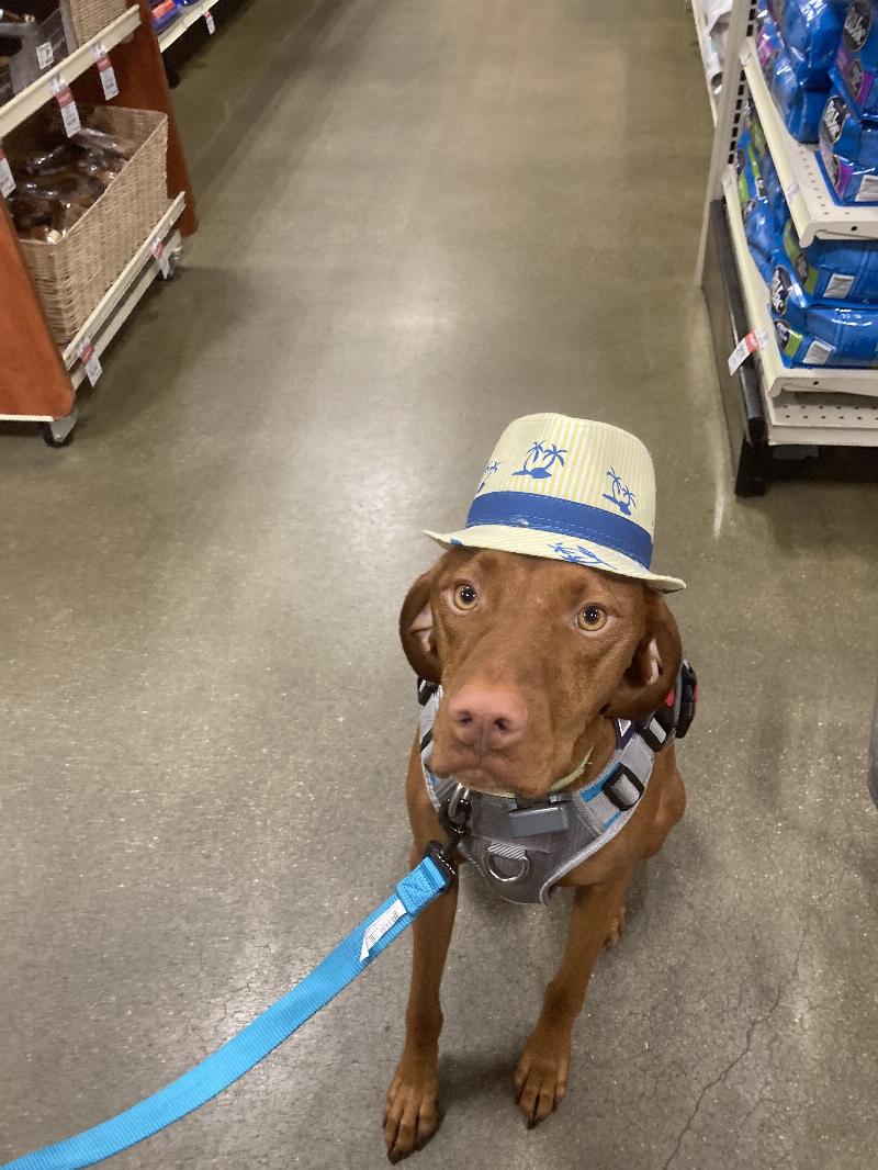 Cute photo of our Moglee. Trying on a hat. He is a service dog for Tammy and emotional support for Toms Adhd and anxiety. He travels with us.