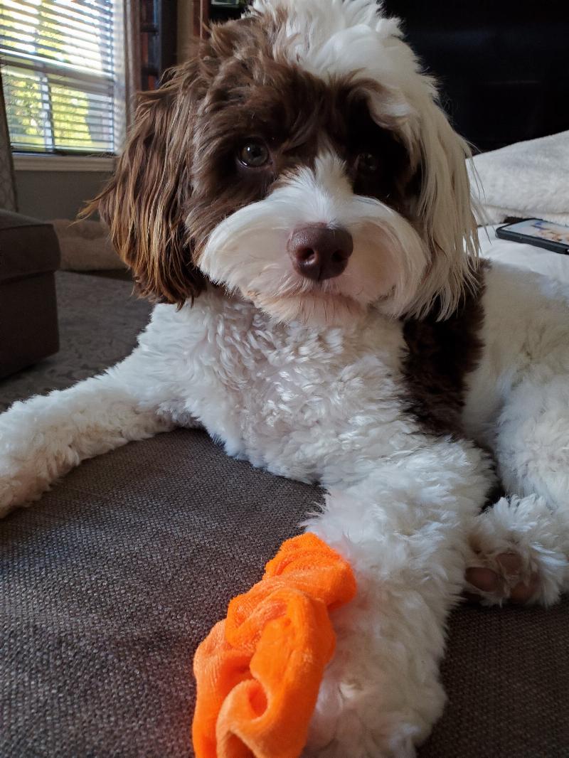 This is Molly at 12 months old. She loves her hair scrunchies and protects them with her life! She is a sweet, loving cuddly pup who loves her family. ??