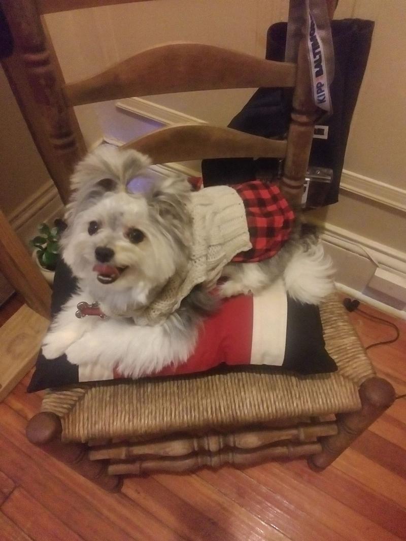 Bella is dressed and ready for her XMAS travel to NJ. Her smile and calm ways lights up the room. Bella is a FASHIONISTA with beautiful white grey black and light brown fur n hair.????