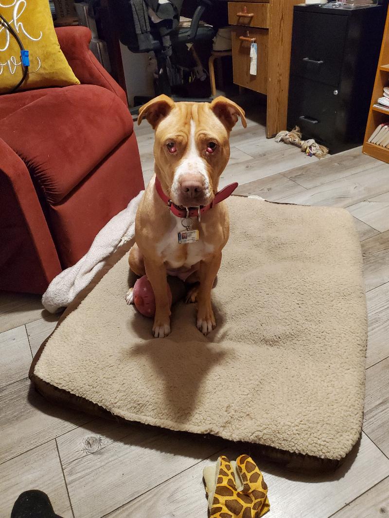 Im chilling in my New bed im happy,love my human mom and she love me and care me.Im play in the yard with her.