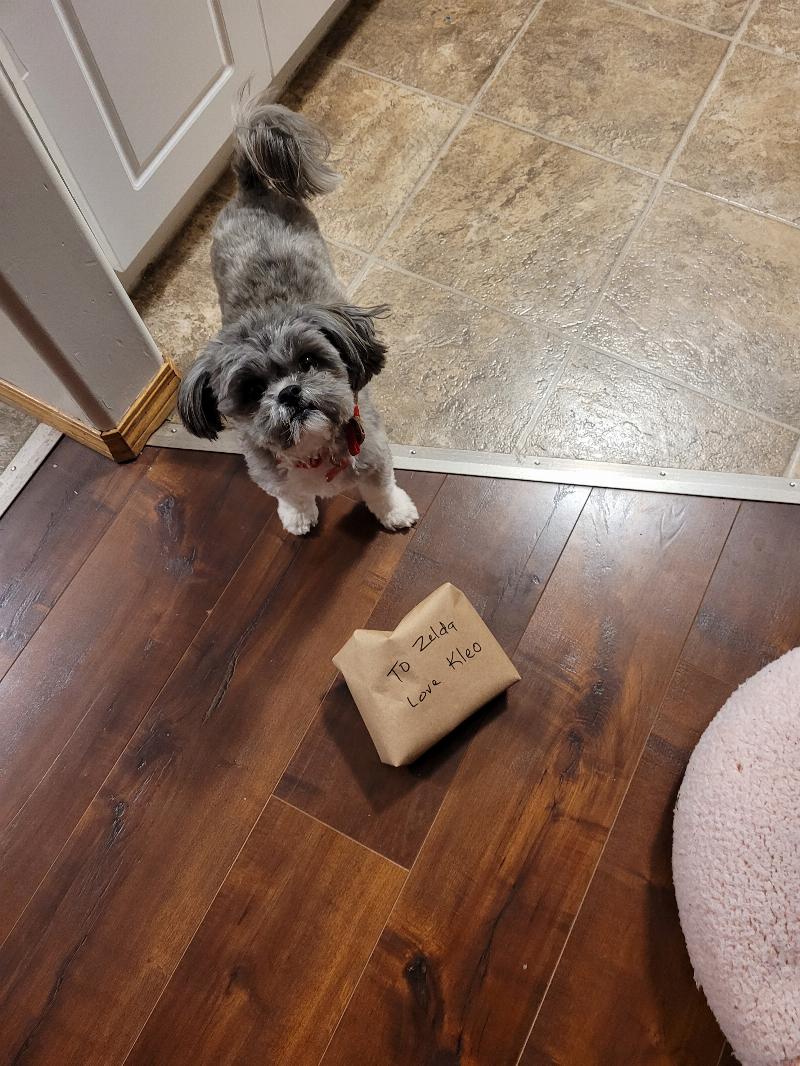 This is Zelda about to open her Christmas gift from her favorite four legged friend, Kleo. The most unlikely of friends, my tiny girl and my sister’s dog, a Bull Mastiff×Rottweiler.