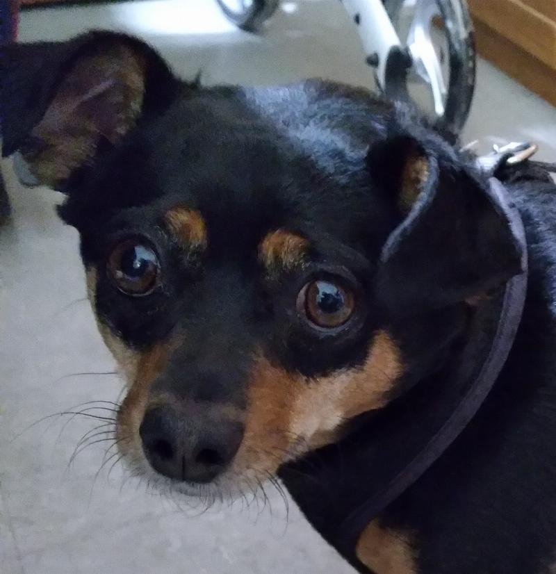 This is my dog Mystic. She is a Min Pin. She is the best companion. She loves to be petted. She loves going on walks when the weather is nice.