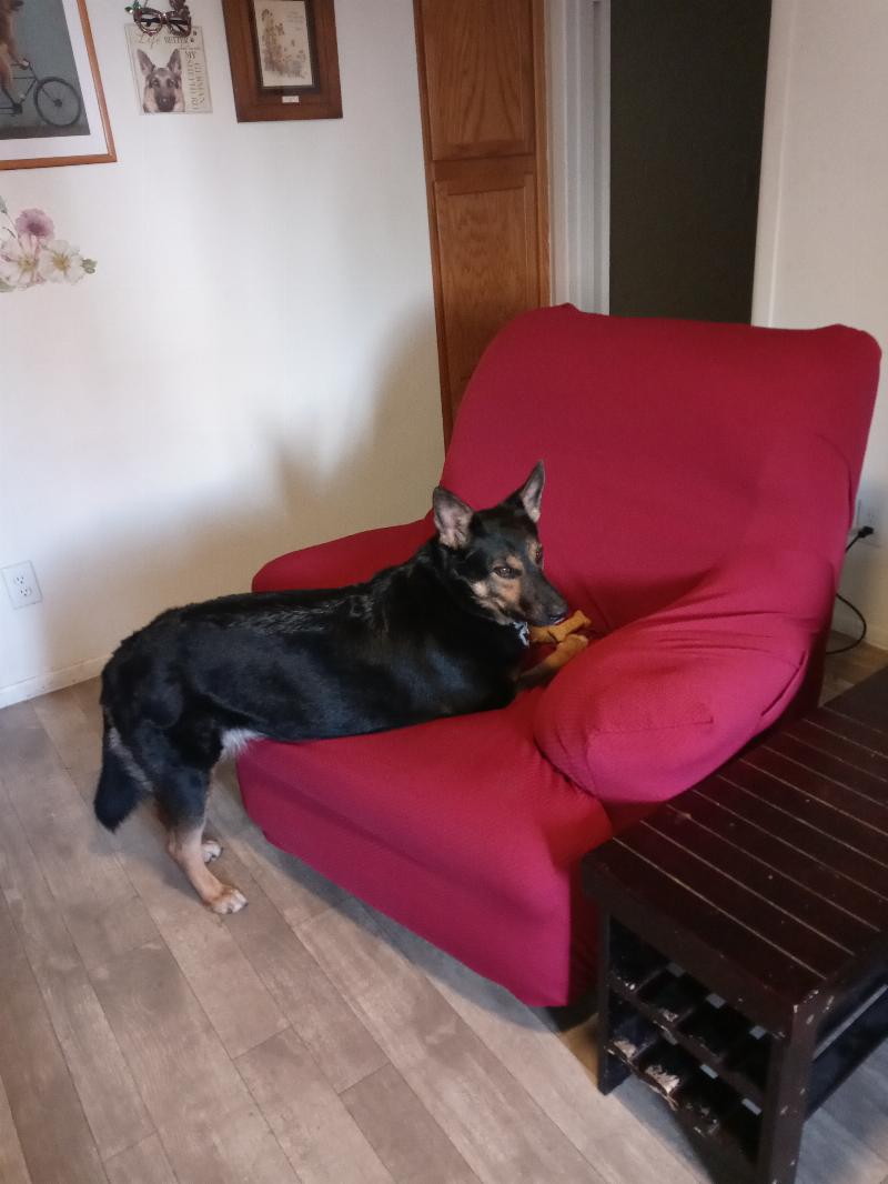 Sausha has always been the inspector of all new things added to her home. She is breaking in the new recliner cover with her milk bone!