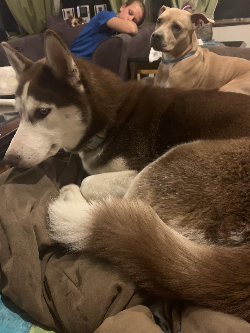 Nikita is Laying on the Couch  in the summer red white female husky…………..love her………..great with kids and other animals!