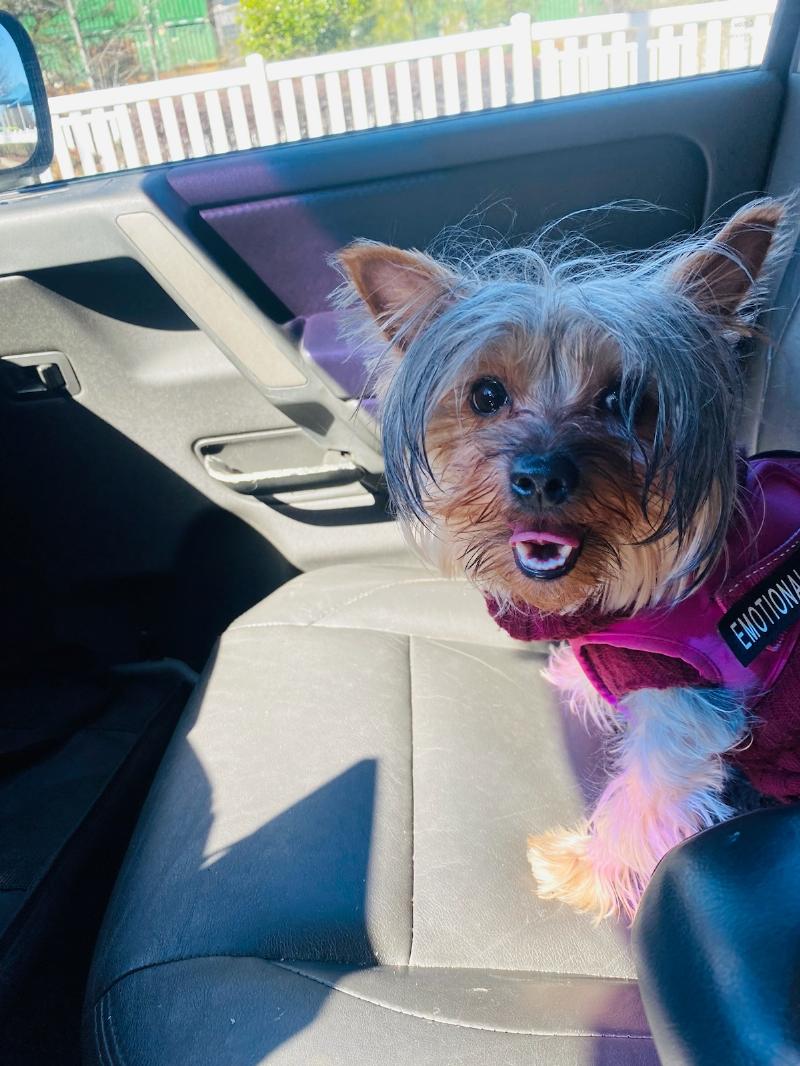 This photo is of Nova Darling Wall,she was 2 years old, his 3 now. She is smiling while siting in my car,her favorite place. She also has ESA vest on.