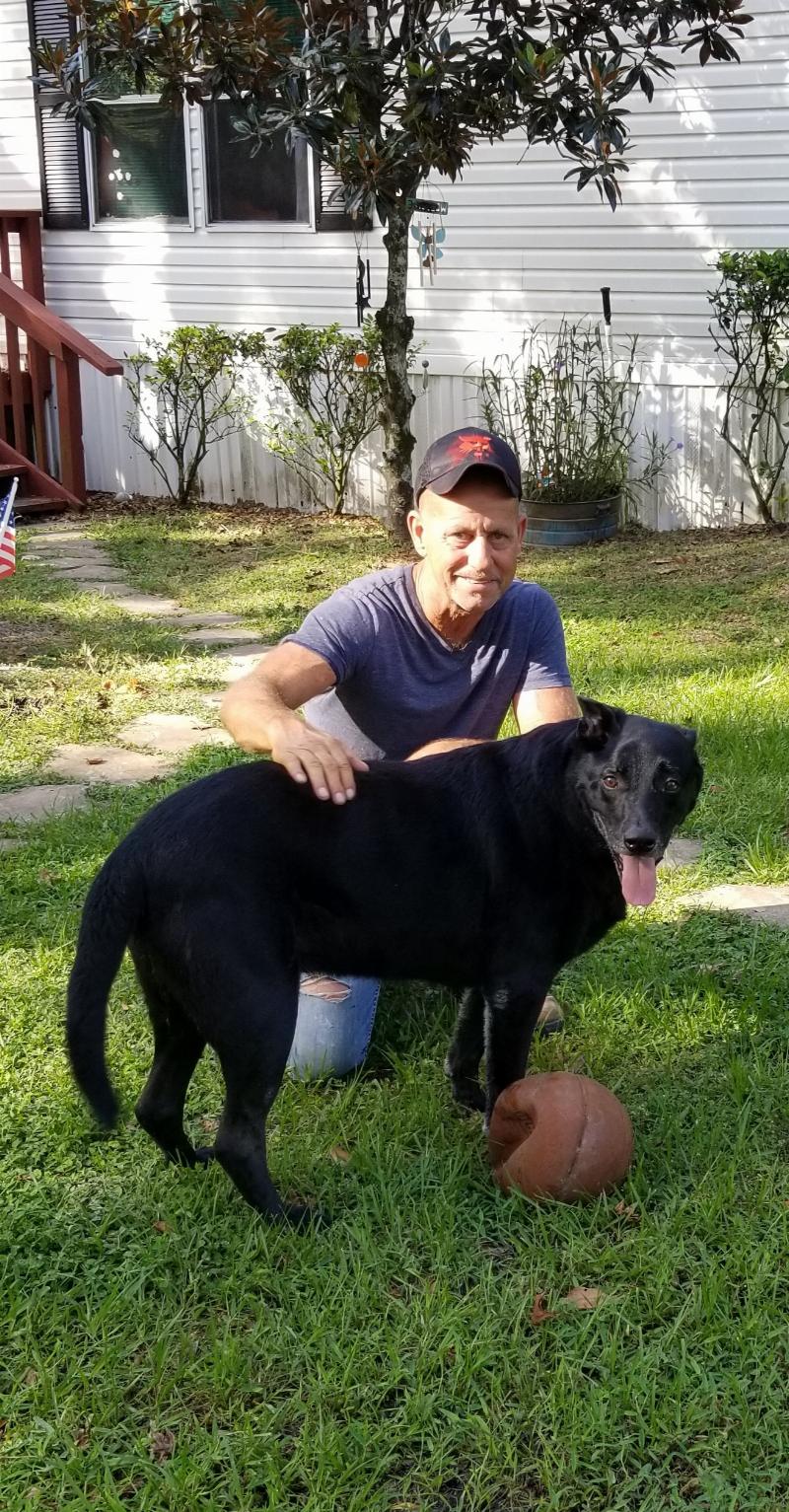 This is Elmer my seizure alert service dog with my husband Dale. Enjoying a day with the kids on the waterslide. He loves getting a little bit of time to play