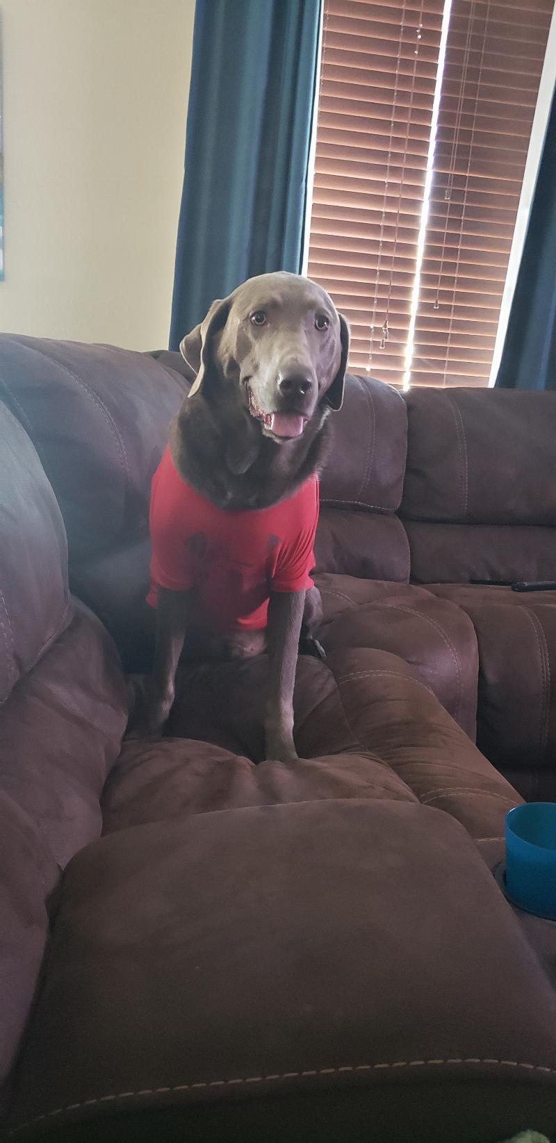 Odin loves to wear shirts. He is patiently awaiting the arrival of his emotional support dog vest so that he can accompany me everywhere.