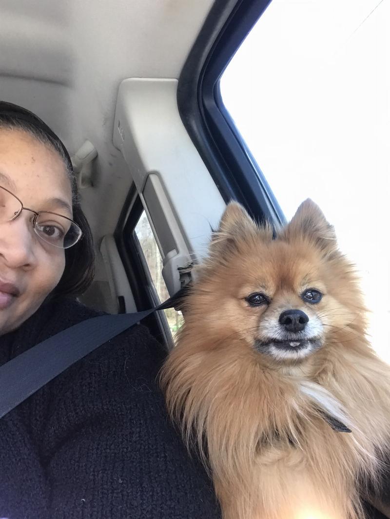 Luckey loves car rides. His favorite seat is on driver left side on a mini zebra pillow.