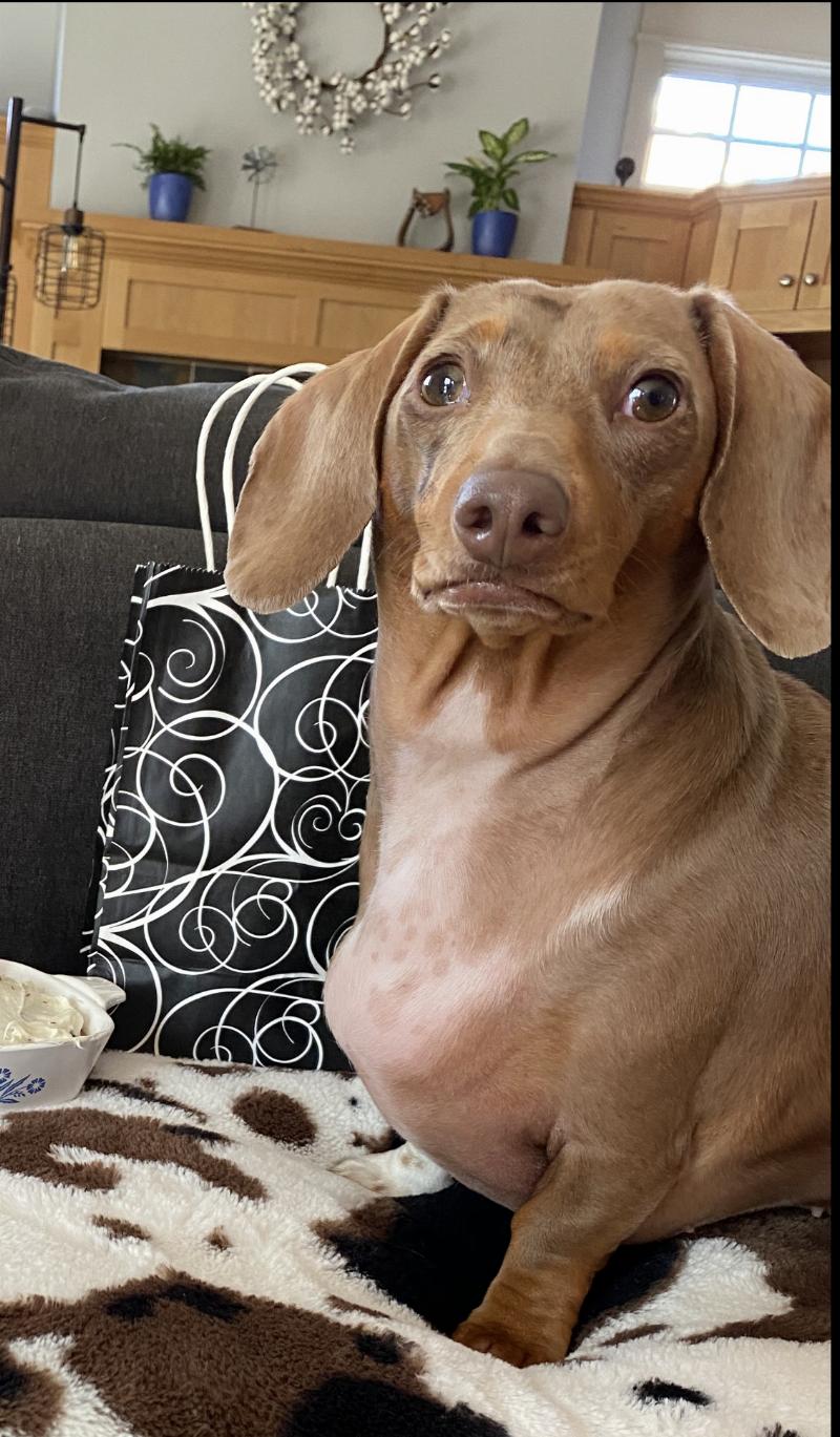 Paisley is a service dog, she can detect anxiety and seizures. Paisley is a two year old dauchound. She is a Isabella dapple pie bald.