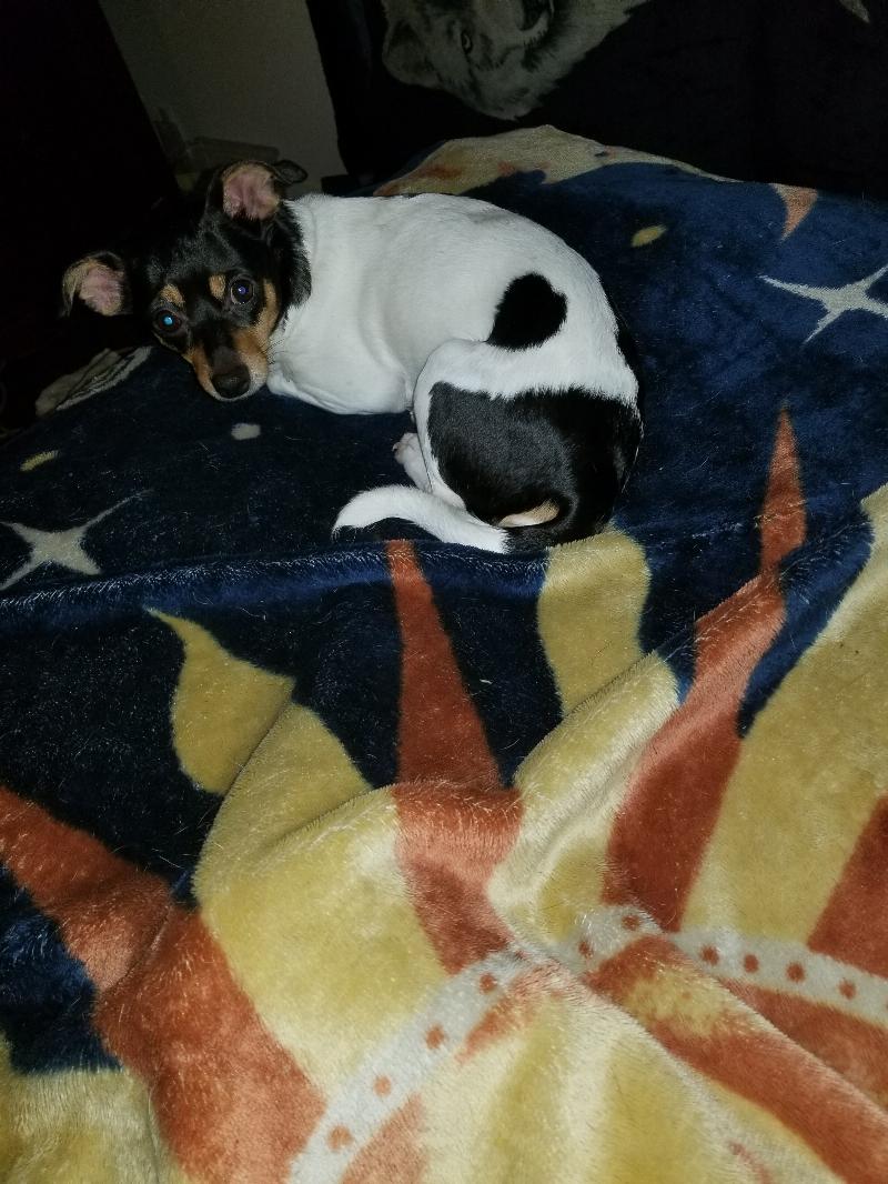 Bellatrix is a black and white chiweenie with a curly tail and a black spot in the shape of a heart on her left hip. She looks a bit like a “Jack Russell”