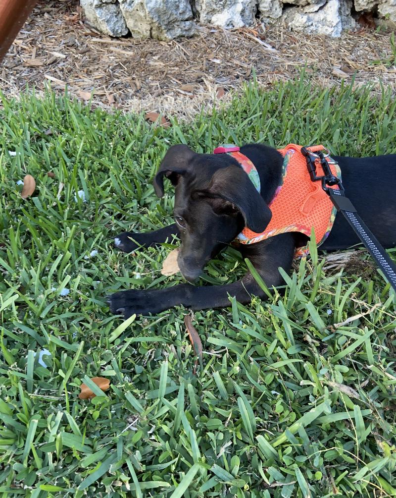 Arabella is 5 months old. Still a puppy in many respects. She knows her name, comes when she is called, and stops biting and gives kisses if commanded. She is in training as an hearing dog. Not too good yet on the slip lead, but steadily improving. Very LOVING!!!