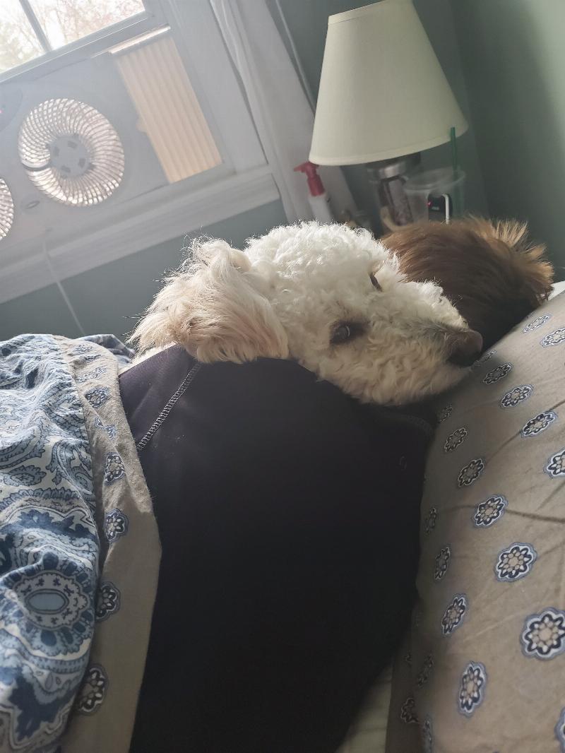 When Luke is in pain, Ham knows to add pressure (lay on Luke to provide warmth and sensory input) and is simply a comfort. When someone else in the house is in pain, he does the same for them!!