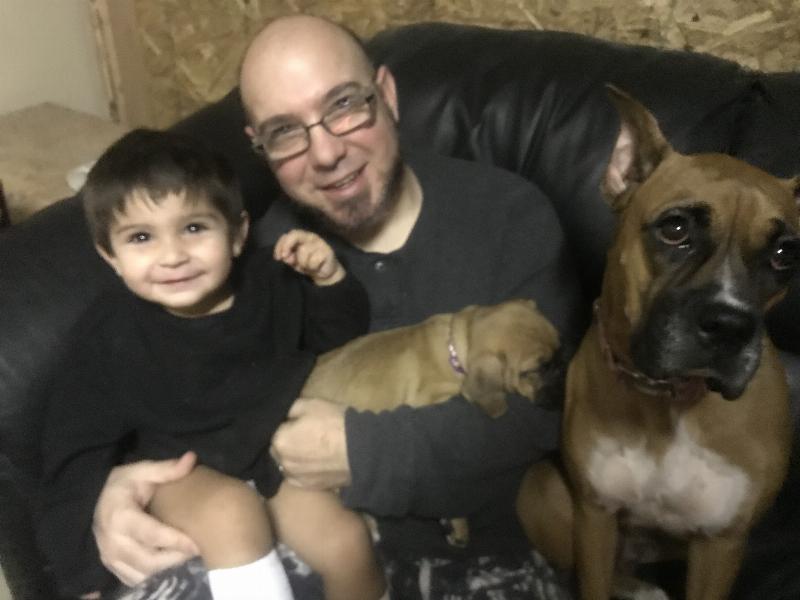 Puppy Molly in Daddy’s arms next to her mommy, Sassy.