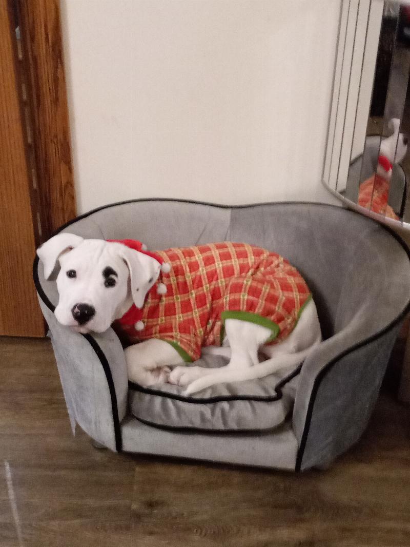 Relaxing in my jammies, in Calgary, Alberta. I am all snuggled up in buddies bed. I love to wear clothes cause it keeps me warm, and I look cute in them.