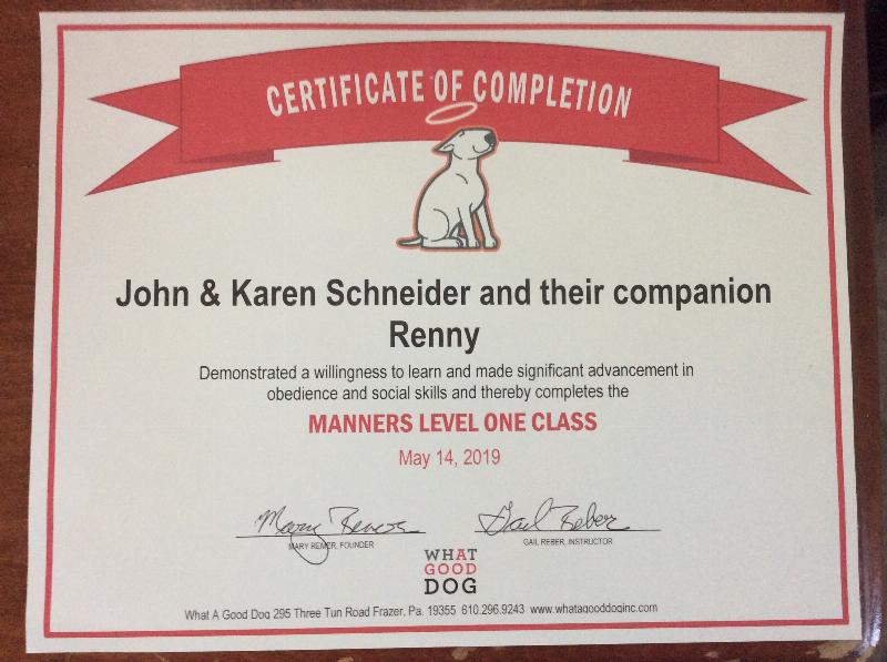 Renny completed early training that demonstrated a willingness to learn and made significant advancement in obedience and social skills.