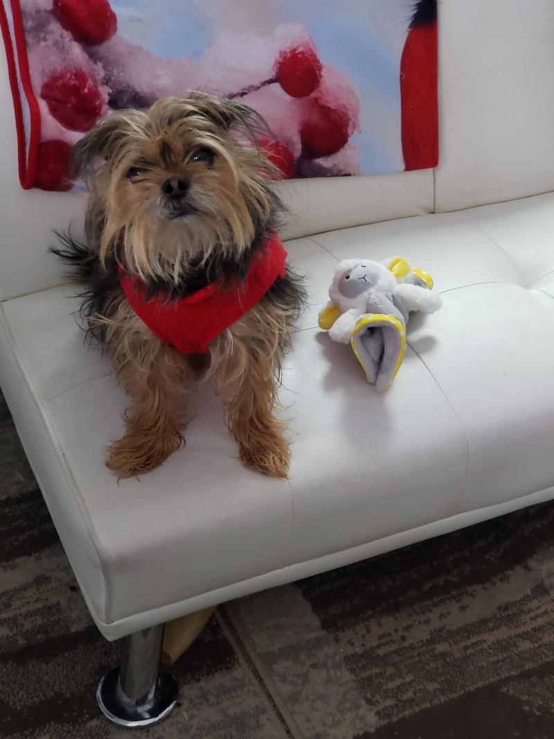 Ruby after her vet appointment with new toy ? ? ? ? Ruby loves toys that squeak and are small. This toy is a bit large for her, but it was a big hit.