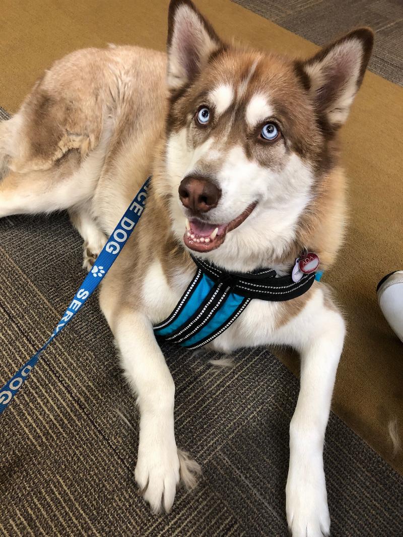 Sarge is a service dog and he is working hard in this photo. Sarge loves to work and is loved by everyone he comes in contact with.