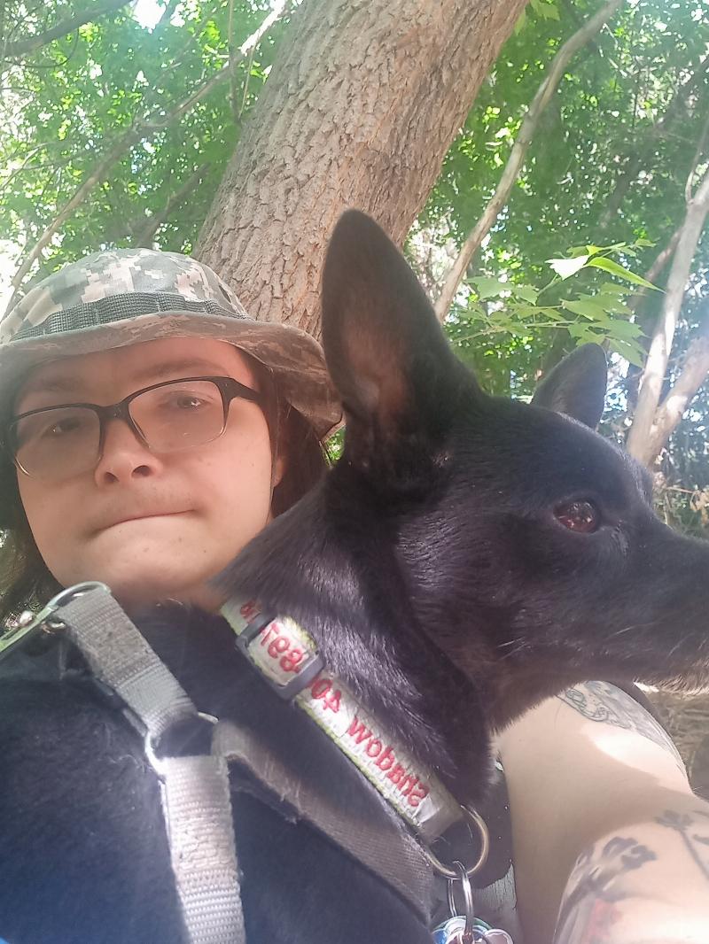 A photo of a picture of Shadow and me together. He goes wherever I go. You will always find him with me. He is the best dog and is highly intelligent.