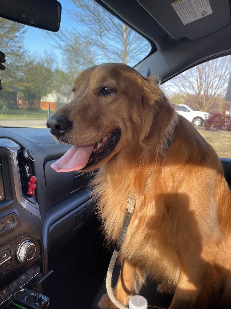 Came from Kansas as a pure bred golden retriever from a ranch that raises emotional support animals. He has the best manners and loves to be petted and van read kids the best since his dad was a terminally ill st Jude patient with Glioblastoma that passed away at 6 yrs old. His grandpa, his dad, is the owner.