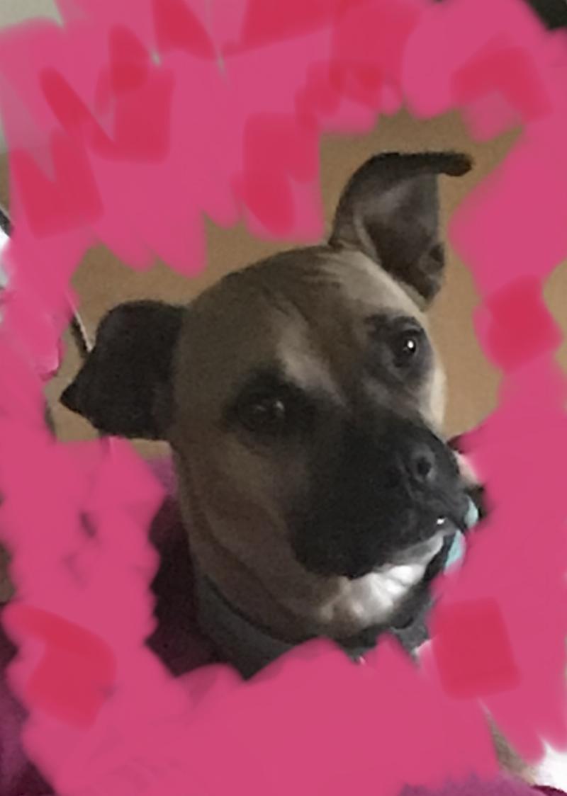 Up close picture of Shea’s pretty face. Shea’s a female boxer pit bull mix. Shea has dark gold tan color short hair coat with dark brown around her eyes and ears, white on her chest and belly.