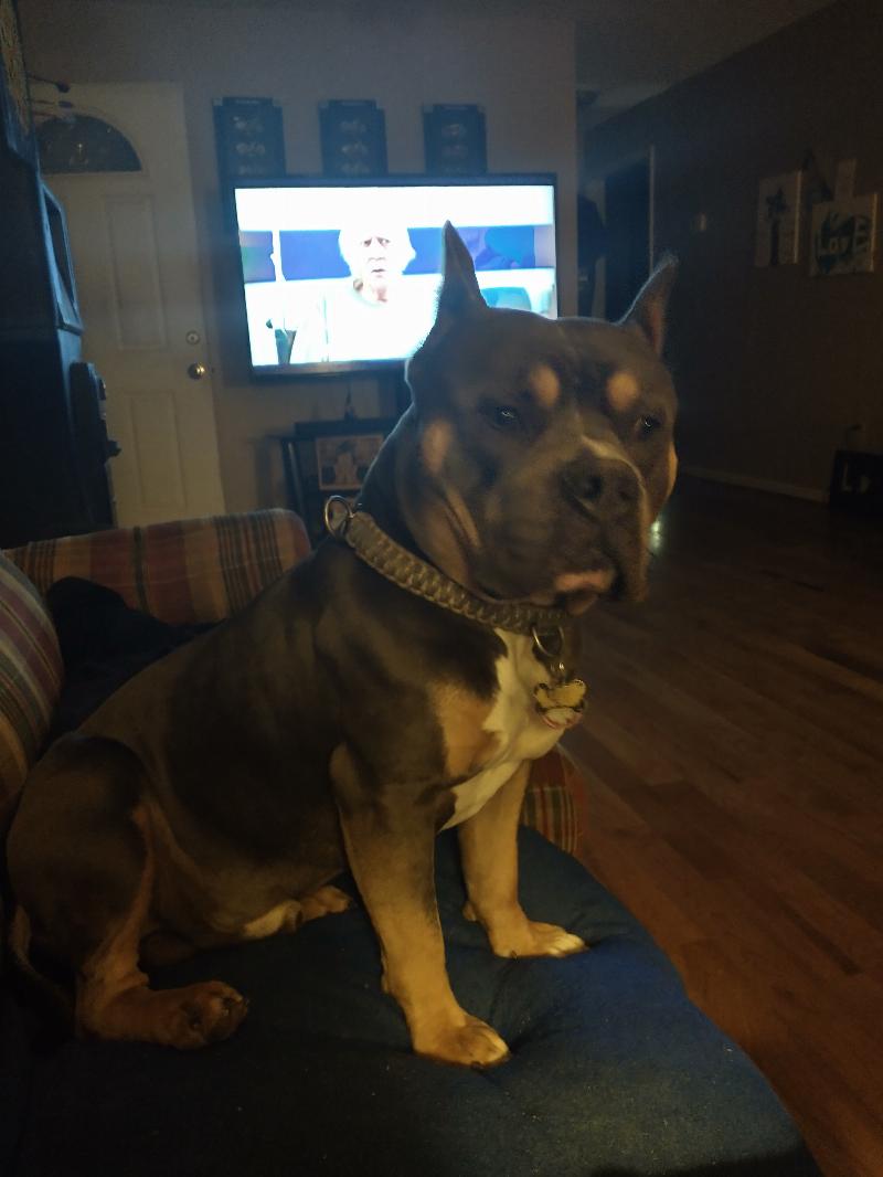Shine Adair sitting, waiting on play time. He loves playing outside and in water. He loves to pull and play with his brother Brahma Bull