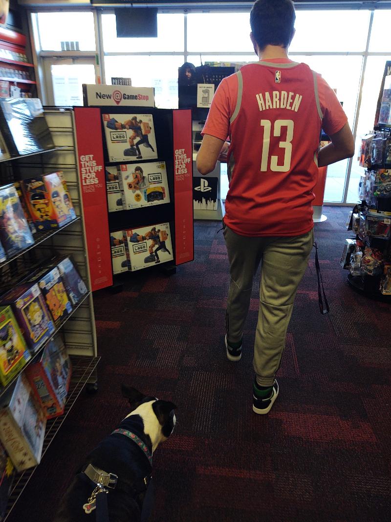 Following my brother through the gaming store trying to help him pick out a game. Honestly I don’t think he needs my help but me and Mom are his escort.