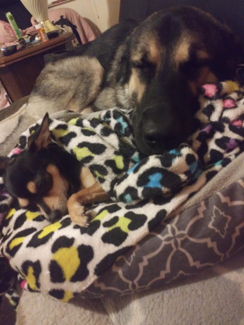 Smokey has a Chihuahua big sister that loves to torment him. They’re so cute when they cuddle together but so rotten when playing with each other. ☺