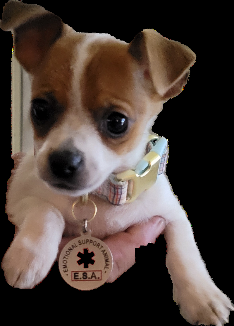 Wearing his tag. Likes to chase my other chihuahua. Already getting porty trained and barking. Growing too fast, wish they stayed little