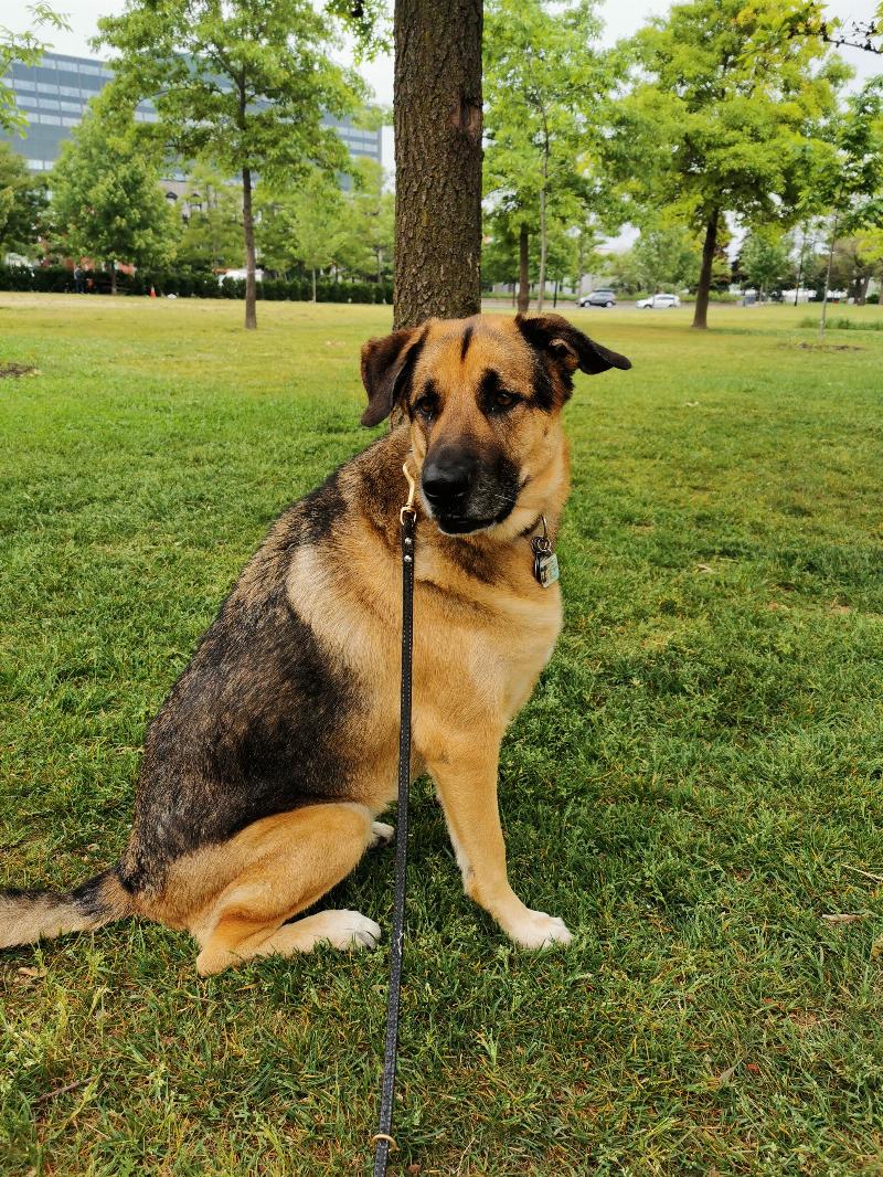 Woody sitting in the park watching people and dogs going by. Staying there as a good boy. Wonderful and sunny day at the park