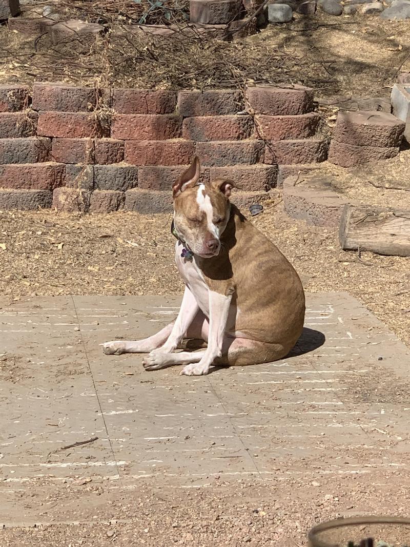 Stella loves sunbathing. She also loves to smile, and group hugs. Stella loves butt rubs. She chews tennis balls like they were bubblegum.