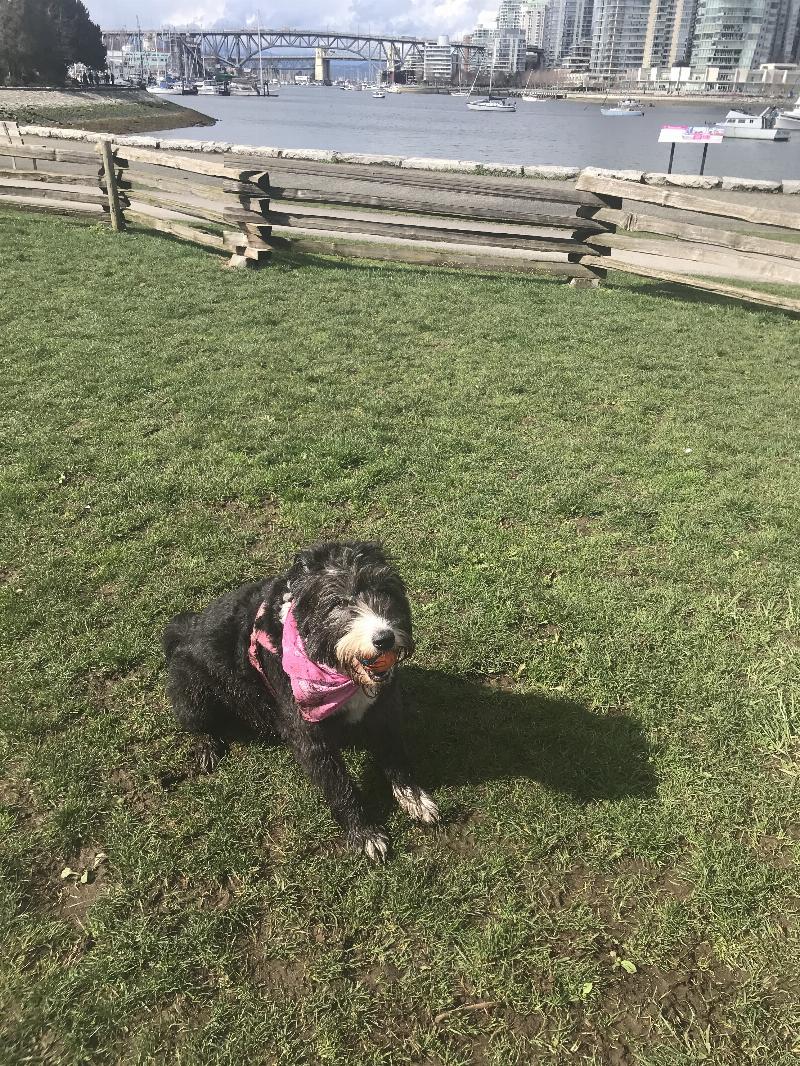 Suzie is at the park on a green grass she is great she has spunk why so many character stupid apps so she was born 9 years ago and she is my amazing support dog