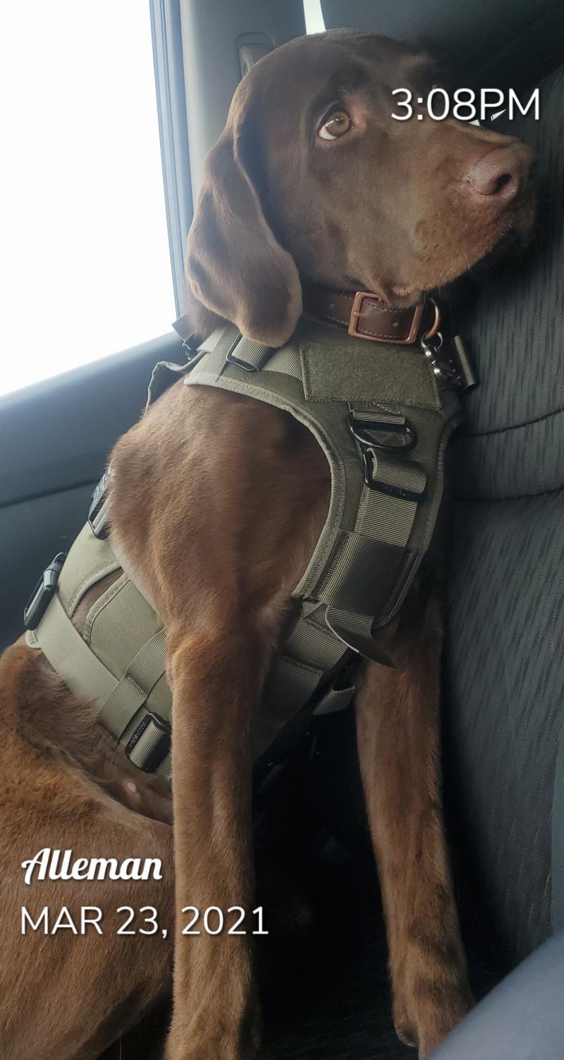 This is Attie in her new vest. I traded in her traditional service vest for a tactical one. She has a leash to match. We love new products.